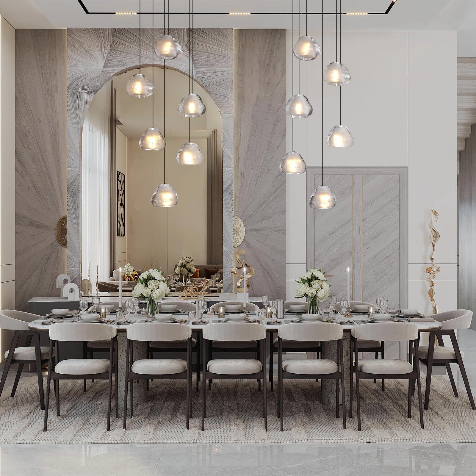 - 【Crystal High Ceiling Chandelier】 Canopy size: 11.81" diameter; each shade: 3.9" diameter; adjustable cord length: 3.9"–78.74". Compatible with AC110V/120V/220V/240V. Includes 6 replaceable warm LED G4 bulbs (5W each, max 20W), delivering 2700 lumens of brightness while saving energy.