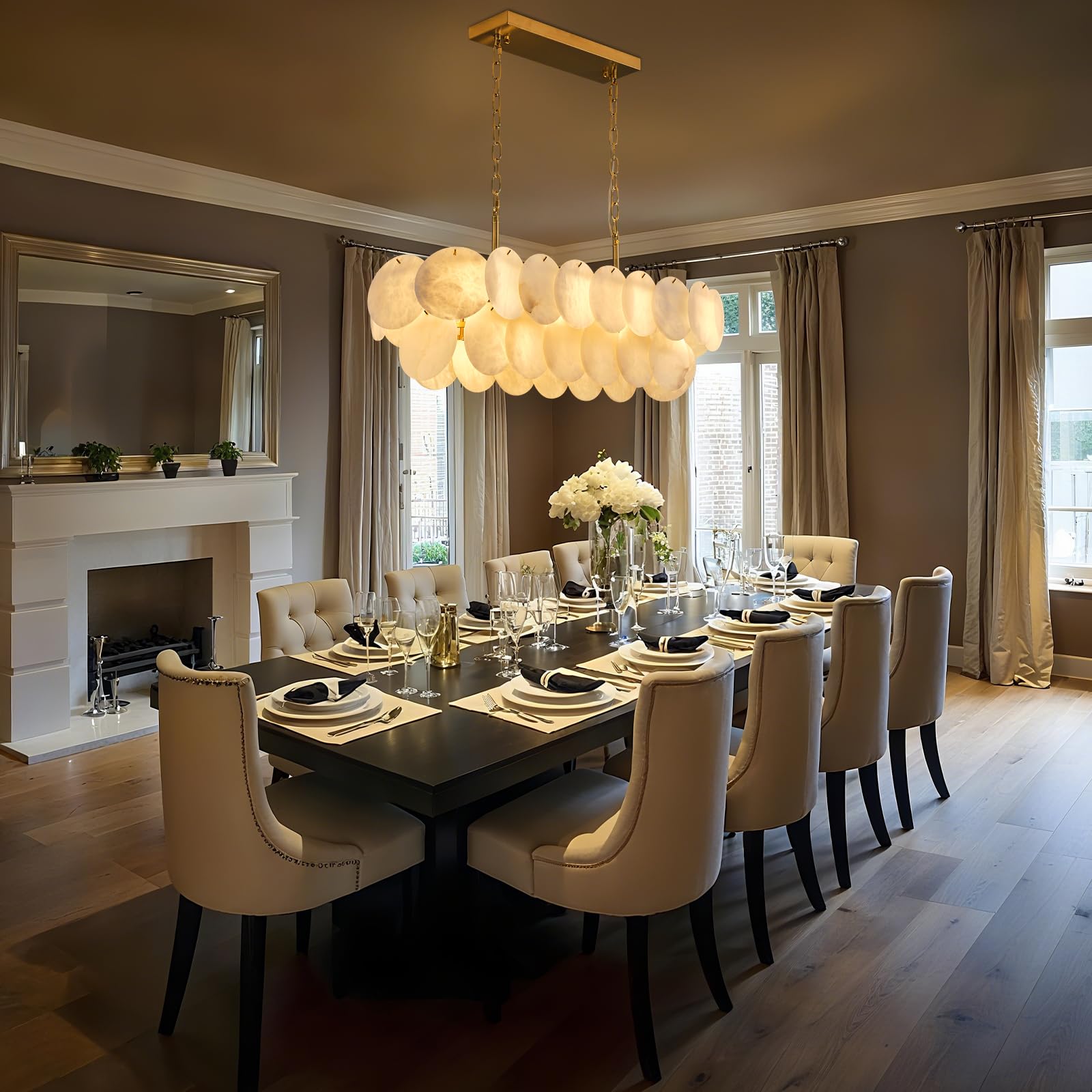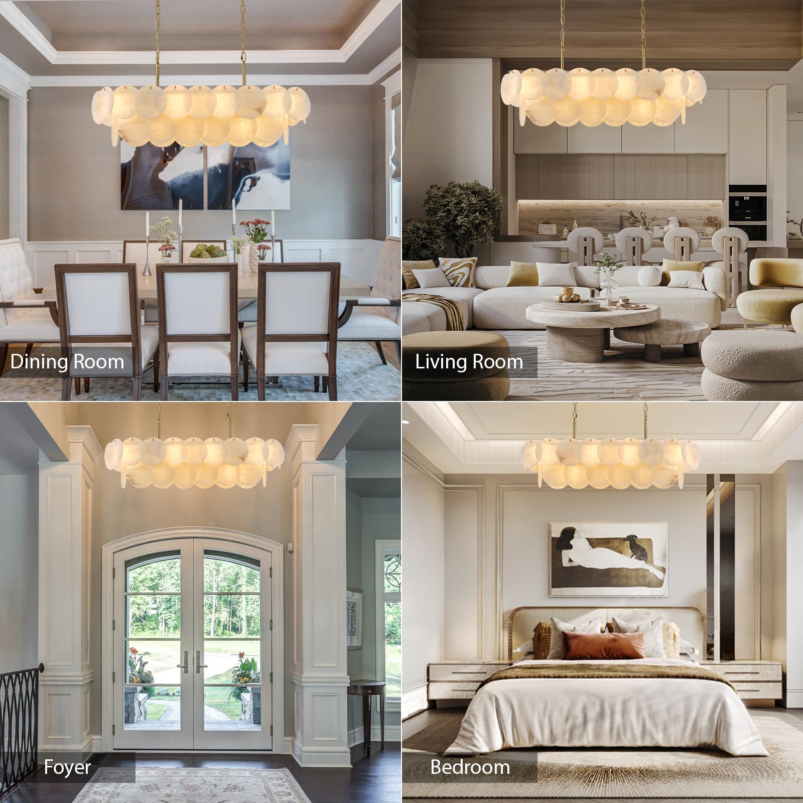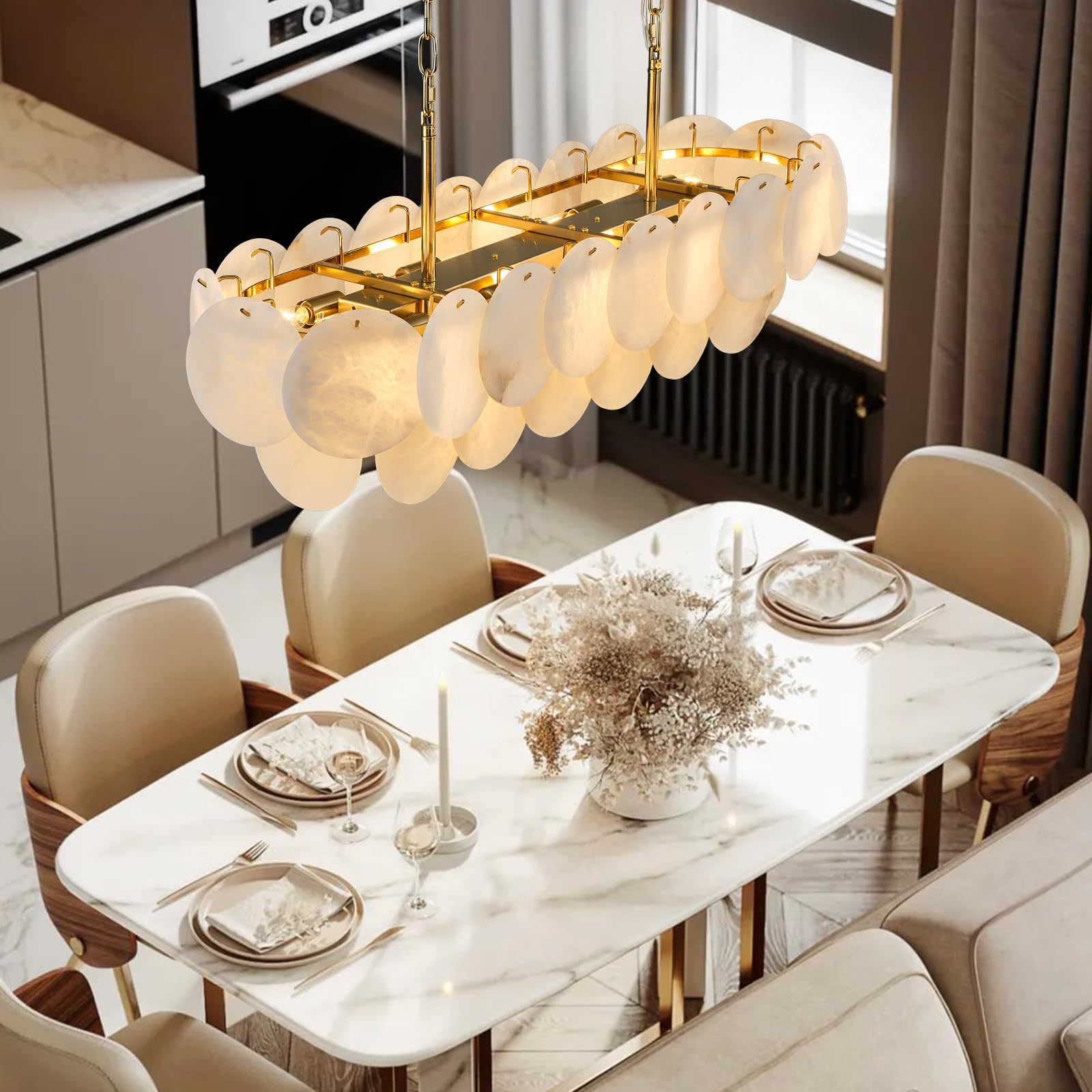 - 【Exquisite Natural Beauty】Crafted from 34 hand-selected alabaster marble pieces, each with its own organic veining, this rectangle chandelier exudes timeless sophistication. The warm, diffused glow enhances any home decor, creating a stunning focal point for dining rooms, living spaces, or bedrooms.
