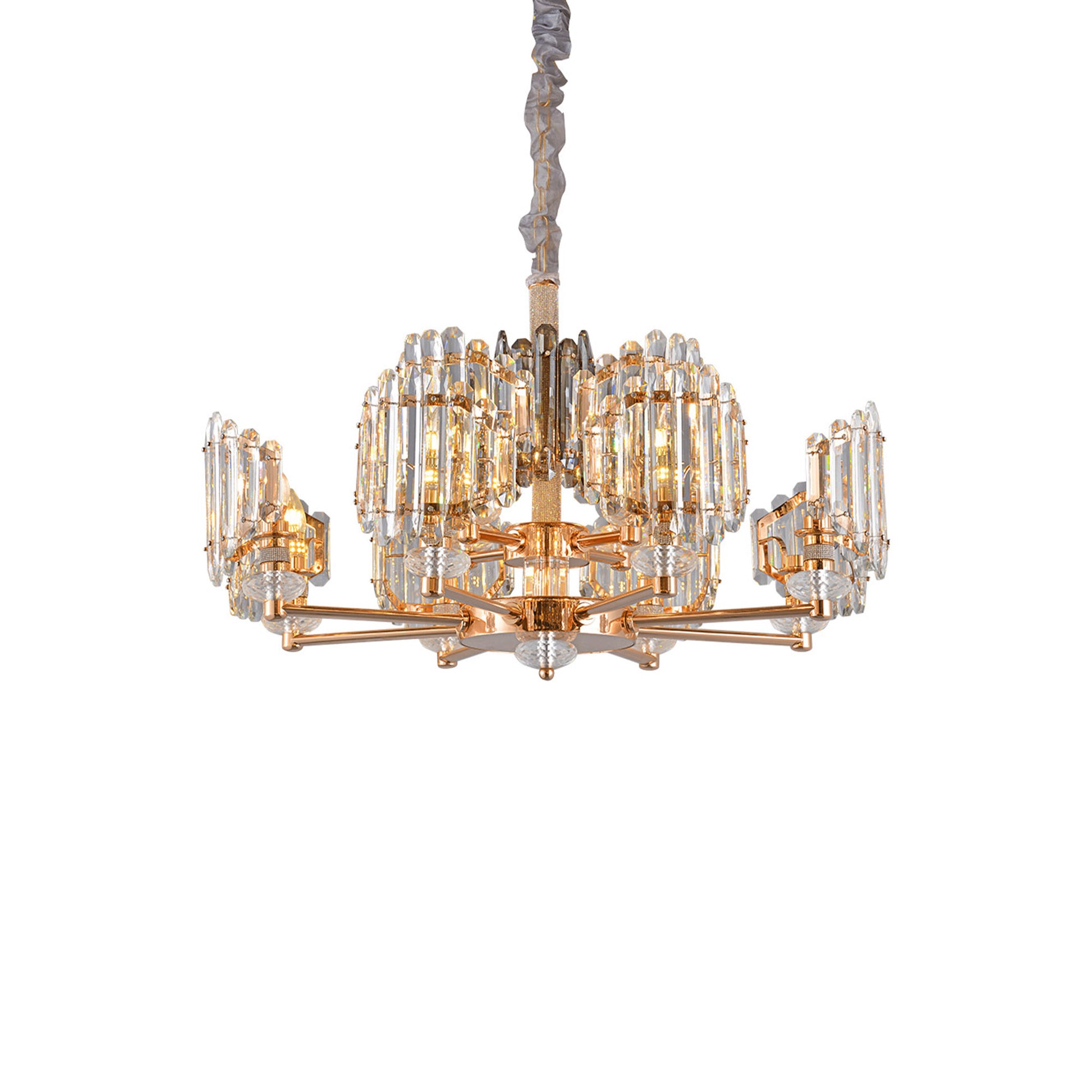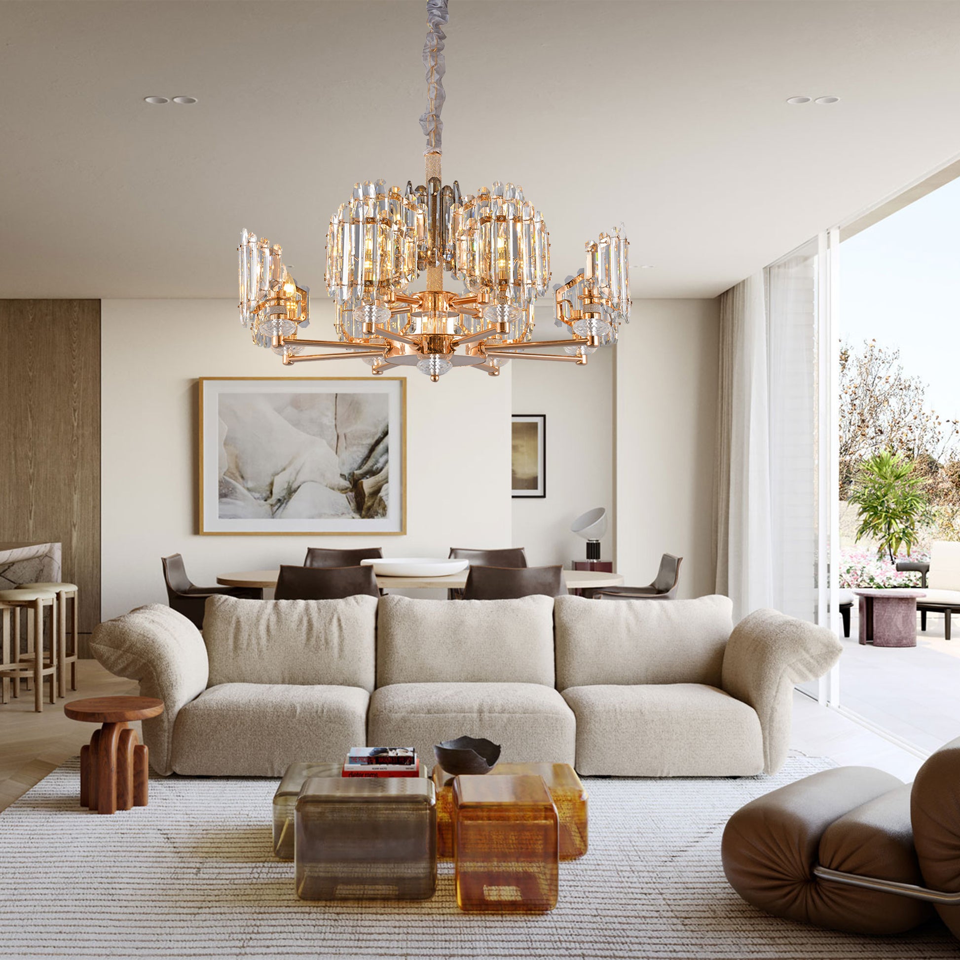 Elevate your space with this stunning modern crystal chandelier—a perfect blend of luxury and contemporary design. Crafted with high-quality K9 crystal rods (polished for maximum light refraction) and a sleek rose gold-plated metal frame, this fixture casts a warm, shimmering glow that transforms any room into an elegant retreat.